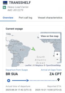 Le Transshelf, actuellement en route depuis Suape (Brésil) vers Le Cap, est attendu vers le 21 octobre. Il chargera le dock Titan avant de se diriger vers La Réunion, la traversée est estimée à 10 jours en mer.